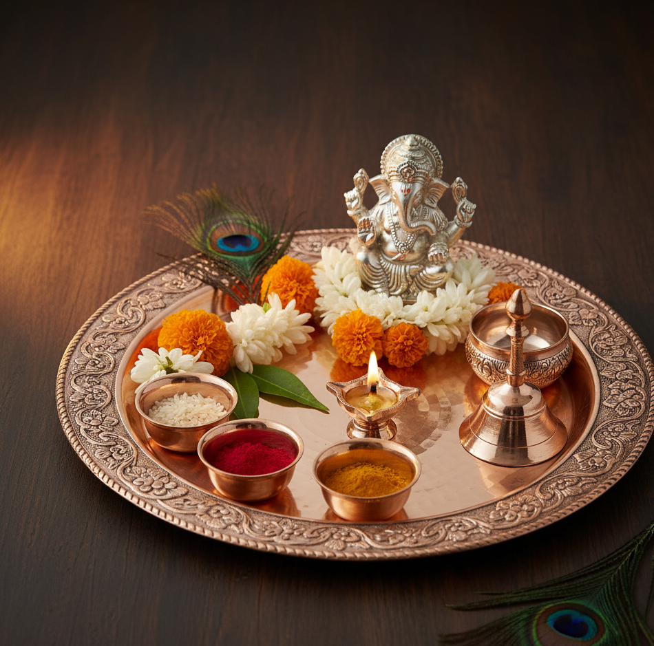 Set Includes: 1 Thali, 1 Diya, 2 Small Bowls, 1 Kalash, 1 Bell
